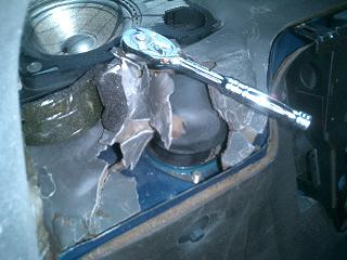 ![]() 下のボルトを外したら、室内でアッパーマウント部分のナット3個(13mm)を外す。