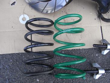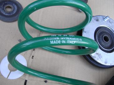 その中でスポーツタイプとなればビルシュタインとKONIぐらいだ。そこで、今回は減衰力調整(伸び側)ができるKONIを試してみることにした。KONIはオランダ製なのだが、大規模なリストラがあったようで入手するのに半年もかかった。 その半年の間に、RACING DYNAMICS(以下R/D)のコイルがRDsportで在庫処分しているのを見つけた。そこで、取寄せてみたのが写真右のコイルだ。 R/Dのイメージカラーである緑に塗装されている。