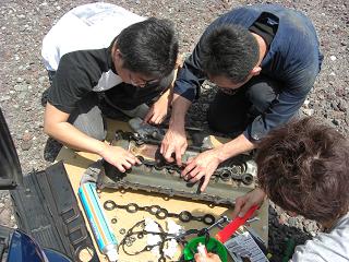 ![]() スロージャーク号の作業がひと段落したところで、chachaさんも加わり液体ガスケットを塗り塗り。